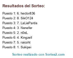Lista de participantes: 1. Sukipei, 2. n0eL, 3. Nenefer, 4. Kingzell, 5. raicoht, 6. hector836, 7. LaLieParda, 8. SikO124.