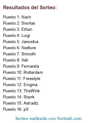 Lista de participantes: Rotterdam, Valr, Janosilva, Starrk, TheWink, Luigi, Astradiz, Fernanda, Nach, p9, Ethan, Freestyle, Enigma, Snorlax, Nedture, Smooth.