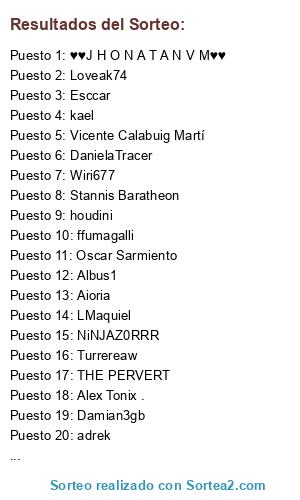 Lista de participantes: oxil, tatacolores, Estratega, ♥♥J H O N A T A N V M♥♥, Fenix Syn Schast'ya, THE PERVERT, GZA, Enkeli Kuoleman, Esccar, Stannis Baratheon, NiNJAZ0RRR, Loveak74, adrek, DanielaTracer, Princep Von Alexandros, houdini, Wiri677, LMaquiel, Triss Merigold, Alex Tonix ., kael, Oscar Sarmiento, Biner, Damian3gb, 11 SAM, ffumagalli, Dr. EthaN!, Turrereaw, Albus1, Cristián Ramírez, Vicente Calabuig Martí, Aioria.