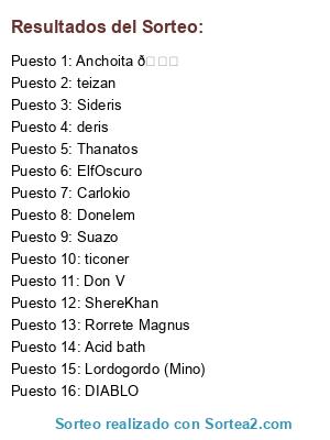 Lista de participantes: Anchoita 🐟, teizan, ticoner, Donelem, ElfOscuro, Rorrete Magnus, Don V, ShereKhan, Thanatod, Suazo, Lordogordo (Mino), Carlokio, Acid bath, deris, DIABLO, Sideris.
