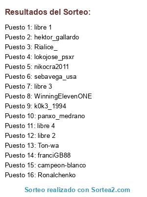 Lista de participantes: nikocra2011, campeon-blanco, sebavega_usa, Ronalchenko, WinningElevenONE, hektor_gallardo, panxo_medrano, lokojose_psxr, franciGB88, Ton-wa, Rialice_, k0k3_1994, libre 1, libre 2 , libre 3, libre 4.