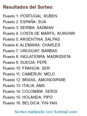 Lista de participantes: ESPAÑA: SUA, ALEMANIA: CHARLES, BRASIL: AMONOSPARE, COLOMBIA: SERGI, ITALIA: AMS, ARGENTINA: SALPAS, COSTA DE MARFIL: KURUNIR, SUECIA: PEPE, PORTUGAL: RUBEN, INGLATERRA: MADRIDISTA, CAMERUN: MELO, HOLANDA: PIPO, FRANCIA: SER, URUGUAY: BARBAS, BELGICA: YIN-YAN, SERBIA: SADMAN.