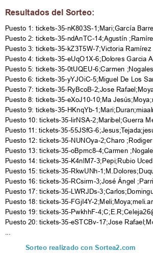 - Regalo comercio : tickets-35-lirNSA-2;Maribel;Guerra Mellado;maribel.gm73@hotmail.com;