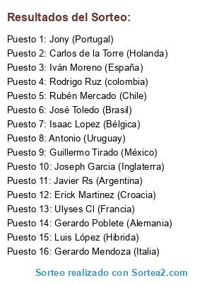 Lista de participantes: Erick Martinez (Croacia), Isaac Lopez (Bélgica), Luis López (Hibrida), Javier Rs (Argentina), Rubén Mercado (Chile), Gerardo Poblete (Alemania), José Toledo (Brasil), Joseph Garcia (Inglaterra), Gerardo Mendoza (Italia), Carlos de la Torre (Holanda), Rodrigo Ruz (colombia), Iván Moreno (España), Jony (Portugal), Ulyses Cl (Francia), Guillermo Tirado (México), Antonio (Uruguay).