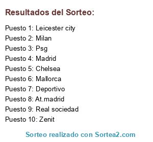 Lista de participantes: Madrid, Deportivo, Zenit, Chelsea, Psg, Mallorca, At.madrid, Real sociedad, Milan, Leicester city.