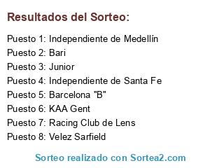 Lista de participantes: Independiente de Santa Fe, Independiente de Medellín, Junior, Velez Sarfield, KAA Gent, Bari, Barcelona "B", Racing Club de Lens.