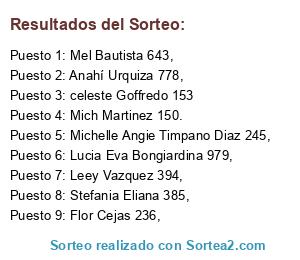 Lista de participantes: celeste Goffredo 153, Stefania Eliana 385,, Mel Bautista 643,, Leey Vazquez 394,, Anahí Urquiza 778,, Flor Cejas 236,, Lucia Eva Bongiardina 979,, Michelle Angie Timpano Diaz 245,, Mich Martinez 150..