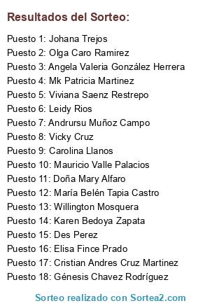 Lista de participantes: Doña Mary Alfaro(3 participaciones), Angela Valeria González Herrera(3 participaciones), Elisa Fince Prado(3 participaciones), Mauricio Valle Palacios(3 participaciones), Willington Mosquera(3 participaciones), Johana Trejos(3 participaciones), Cristian Andres Cruz Martinez(3 participaciones), María Belén Tapia Castro(3 participaciones), Mk Patricia Martinez(3 participaciones), Leidy Rios(3 participaciones), Olga Caro Ramirez(3 participaciones), Viviana Saenz Restrepo(3 participaciones), Vicky Cruz(3 participaciones), Karen Bedoya Zapata(3 participaciones), Génesis Chavez Rodríguez(3 participaciones), Andrursu Muñoz Campo(3 participaciones), Des Perez(3 participaciones), Carolina Llanos(3 participaciones).
