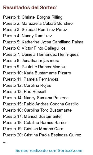 Lista de participantes: Veronica Rubio Muñoz, Andrea Jara Saavedra, Denisse Domínguez Weisser, Veronica Laso Ruiz-Tagle, Tatiana Acevedo, Nunny Ramírez, Ingrid Alarcon, Elmo Silva, Micaela Ricca, Claudia Osses Moraga, Ximena Garcia Baeza, Waleska Silva, Nancy Concha, Vargas Paula, Pía Avilés, Gladys Uribe Cuevas, Maria Jose Gutierrez, Kathy Diaz Kdpsb, Barbara Rosa, Maria Isabel Reveco Molina, Javier Vega, Cristina Gutierrez Reveco, Daniela Arriagada Clivio, Natalia Guerra, Pamela Fernández, Francisca Javiera Vargas Covarrubias, Dayana Stephanie Bustos Inostroza, Carolina Gutierrez Sepulveda, Jonathan rojas mora, Fabiola Reyes Fuentes, Cata Espinoza Amengual, Soledad Ramírez Pérez, Virginia Castillo Pavez, Claudio Beroiza Henriquez, Marcela Olivos, Diego Garcia, Sofia Soto Santolaya, Jaime Arias, Carolina Carriel Rodriguez, Juan Bertoli Fernandez, Pamela Limedrac, Cecilia Bernal Muñoz, Berny Q. Ortiz, Robson Watt Chaverini, Daniela Fernanda Gutiérrez Beiza, Ana Vargas, Sandra González Quezada, Mariela Martel Bascur, Mariana Zúñiga, María José Jiménez Robledo, Pamela Castillo Retamales, Víctor Pinto Galleguillos, Paola Arévalo Lucero, Grimanessa Cherie, Juanito Plaza, Karin Clavero V., Sandra Rojas Poblete, Denisse Alvarado Jeria, Paola Villalobos, Cristian Moreno Caro, Rodrigo Bravo, Victor Amaro, María Elena Beltrán, Andrea Cecilia Castro Hernandez, Carlos Roco Benavides, Patricia Soledad Abarzúa Quiroz, Alejandra Godoy, Christian Chamorro Lopez, Caroll Martell Briones, Carito Vildoso Castillo, Ricardo Godoy Barra, Camila Fernanda Quiroz Araya, Alejandra Bizama Muñoz, Valentina Alvear Obregón, Alejandrina Santander Maldonado, Maximiliano Bravo, Marisol Muñoz Estévez, Hernan Herandez H, Pamela Rozas Vega, Ricardo Vera Navarro, Lissette Marjorie Espinoza, Daniela Hernández Henríquez, Palomitha Belen San Juan, Carolina Gonzalez, Viviana Navarro Parraguez, Karen Marfull, Muriel RodrÃguez Bascur, Ines Macarena Valdebenito Borjes, Marcela Gómez Jacque, Juliana Villarroel Ruiz, KarÃm Carolina Palacios, Natalia Carina Herrera, Gabriela Salah, Claudia Gonzalez, Paulina Silva, Jorge Crisóstomo Loyola, Monserrat Gonzalez N, Nano Scheel, Adrian Curguan, Natalia Vega Riveros, María Eliana Jirón Ramírez, Catalina Sanhueza A, Carla Alejandra Nieto Aguirre, Roberto Castillo Acevedo, Jimena Cabezas Chiu, Katherine Jycsa Cantillano Palma, Carolina Rojas, Cristian Lambrecht Rojo, Beatriz Carolina Cortes Araya, Paula Alexia, Nelson Vallejos Gutiérrez, Paula Mendoza, Vaneciwi Asalgado Araneda, Carlos Barrera, Valeska Alejandra Gonzalez Hernandez, Johanna Carolina Rebolledo Ramos, Araceli Sandoval Dinamarca, Tatiana Arriagada, Jose Nazar, Alejandro Toledo Perez, Christel Borgna Rilling, Paola Mauro Roumat, Nicole Moya, Eduardo Huilipan, Karina Zúñiga, Mauricio Carrasco Diaz, Catalina Barrios Barrios, Sandy Peña, Susana Long, Maribel Sainz Cacho, Paulina Saavedra Vasquez, Carolina Yáñez L., Pamela Patricia Sanchez Godoy, Pablo Andres Concha Castillo, Vanesa Droguet, Barbara Nickol Solis Jordan, Ismael Miranda, Yezzika Godoy, Karina Folch Escobar, Nathalia Arcos Fuentes, Marcela Perez Guajardo, Orielle DÃaz, Maruzzella Cabiati Mondino, Francisca Nicole Torres, Valeria Alvarado, María José Villena, Marisol Bustamante, Gustavo Maidana, Patricia Cayo Gonzalez, Claudia Alvarez González, Seba Exequiel Vargas, Dianira Manriquez, Maria Paz Gonzalez Carreño, Nancy Santana Pastene, Alejandra De La Fuente, Karen Danner Jaramillo, Cristina Paola Espinoza Quiroz, Natalia Maldonado, Veronica L. M. Cáceres, Leslie Venegas, Rayen Valenzuela Torres, Carla Solis Aravena, Francisca Moyano Anfossi, Karen Buch, Jennifer Salazar Rossi, Cynthia Oyarzún Díaz, Susy Alvarado, Felipe Marin Valdivia, Pamela Jeria Pizarro, Paula Rodriguez, Julia Cassi Vicencio, Carolina Aguayo L., Shishon Palmera Cid Hidalgo, Yolanda Rosangela Vargas, Javierita De Espándola Rojas, Miriam Veronica Ojeda Castro, Vanessa Zavala, Teresa Nataly Hidalgo, Gretel Ibaceta Bascuñan, Marta Cortez, Samuel Miller, Liliana Villanueva Nilo, David Jeria, Jess Paola, Nancy Jacqueline Villarroel Osorio, Maria Teresa Guzman Medina, Claudia Cepeda, Paulina Angulo Lagos, Pau Russell, Jorge Estrada Zúñiiga, Jocelyn Karina Alejandra Correa Campos, Fernanda Montecinos Leis, Macarena Chacon Valdivia, Paz CG, Claudia Diaz, Alejandra Llanos, Marianne Riethmuller, Valentina Isabel Segura Castillo, Carolina Torres Fernandez, Fabiola Cristina Lebtun Henriquez, Paula Andrea Lorca Aran, Maria Eugenia Correa, Jorge Luis Sanchez Silva, Pauly Flores Aravena, Cristina Pino Muñoz, Carolina Inzunza G, Karla Bustamante Pizarro, Carolina Toro Bustamante, Marcela De La Torre, Kata Pfeiffer, Paulette Ramos Moena, Maria Francisca Aguirre Perez, Marisol Alvarez Monreal, Fernanda Riquelme, Jessica Rodriguez Galvez.