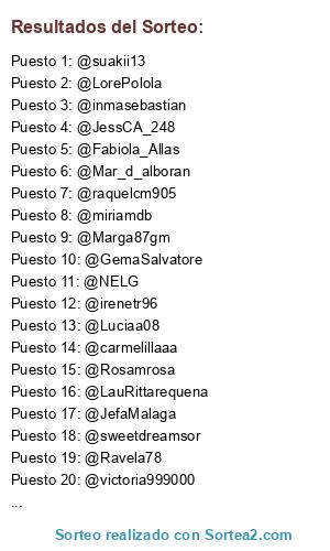 Lista de participantes: @rutyalonso_ruth , @amandadiaz_15 , @JefaMalaga, @Nuria_Gallego , @maygodoy80 , @emfuxo , @LauRittarequena , @Lazarillo67069, @RGA_90 , @ponce_patry , @AnaAnabelenlp, @Estherc_s , @ChaySilvia , @IsabelArcos8 , @espearcos , @besoyca, @Elenichii , @EstherYoutube , @nailsvanessa, @maxma1313, @victoria999000, @vickyroomero12, @lauracg52, @mafaldy_la_loka , @angelesromero10, @AelitaAna, @InmaAdorna, @LorePolola, @alicia_contr, @betiquillas, @alexcris090612 , @Memezapata0707, @Marga87gm, @V_arii_V , @CornejoRT, @belum84, @orcarmen , @irenetr96, @miriamdb, @sweetdreamsor , @yan_ire , @Luciaa08, @noeliaferrero1 , @IsaMSdb , @NELG , @noelia91fc, @Mar_d_alboran, @Fabiola_Allas, @twiteras_Plopez , @VictoryNerea, @SoniaMelgares, @inmasebastian, @ep_jenny , @TrianaCantero, @sorita43 , @Pilaretavlc, @raquelcm905 , @Sara__whitney , @alejy16 , @miriDG_, @raquelcm905, @laurita019 , @02mariia , @evasusini , @Flor_DVG, @MartitaMalaga , @merchi_yc, @peanlou, @GemaSalvatore, @quina100 , @miriju13 , @lisbhet69, @Rociollanera, @YoliXerez3 , @carmelillaaa, @claudia_nqd , @otrabanderista, @alboranista_95, @CyntiaMalaga, @Noichy01, @vicky_malaga, @JeennyCordoba17, @teresacerezo1, @Rebee_Espania, @lolacazerola, @DDMalaga, @AnabelBorregoI, @Hadda7, @Marilo_Fdez , @BeatrizVertedor, @tobarrionuevo1, @JudiithJudiith, @zoraidazori , @rocidomin, @ananikka81, @GemaVG1, @Carohiji, @roociolopez1, @caarolopez1, @Rosamrosa, @AngyAcejo, @Emmitadinamita , @Rebee_Espania , @MarikiyaR_CB, @JessCA_248 , @Ravela78, @suakii13, @laurita019, @Maria_DLQ , @DDMalaga , @Trocitovida27.
