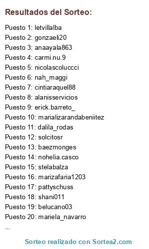 Lista de participantes: monitoons, mariela_navarro, cele_84, estebancaceres06, pamehidalgo91, stelabalza, _anthonellaortiz, letvillalba, marializarandabeniitez, majosegovia31, nicolascoluccci, pattyschuss, dalila_rodas, solcitosr, adricristald, vero_cubilla, betty_sosa, marenadg, nohelia.casco, yiselacaceres, vivianacarolina.valdez.7, rociorivasrodriguez, marlefans, marilu2001_, marthitorres], belucano03, shani011, laureeortiz, dralourdeslopez, baezmonges, abigail.boss, alanisservicios, erick.barreto_, evasanabria01.es, marizafaria7, cintiaraquel88, nah_maggi, raquelvera04', hilda_benitez, gavilan7340, anaayala863, aliciagomez9465, carmi.nu.9, gonzaeli20, marizafaria1203.