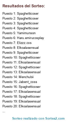 Lista de participantes: Gemtai_, Haru.emirucosplay, Spaghetticoser, Teru.nimbvs, Elkoalasensual, Elkoalasensual, Elkoalasensual, Elkoalasensual, Elkoalasensual, Elkoalasensual, Elkoalasensual, Menchubii, Spaghetticoser, Spaghetticoser, Spaghetticoser, Spaghetticoser, Spaghetticoser, Spaghetticoser, Spaghetticoser, Spaghetticoser, Spaghetticoser, Yamimunson, Jabent_coss, Elizzz.cos, Midna_coser.