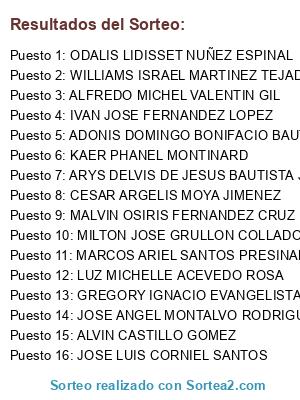Lista de participantes: MALVIN OSIRIS FERNANDEZ CRUZ, JOSE ANGEL MONTALVO RODRIGUEZ, JOSE LUIS CORNIEL SANTOS, CESAR ARGELIS MOYA JIMENEZ, KAER PHANEL MONTINARD, ALFREDO MICHEL VALENTIN GIL, MILTON JOSE GRULLON COLLADO, IVAN JOSE FERNANDEZ LOPEZ, ARYS DELVIS DE JESUS BAUTISTA JIMENEZ, MARCOS ARIEL SANTOS PRESINAL, ADONIS DOMINGO BONIFACIO BAUTISTA, WILLIAMS ISRAEL MARTINEZ TEJADA, GREGORY IGNACIO EVANGELISTA SANCHEZ, ALVIN CASTILLO GOMEZ, ODALIS LIDISSET NUÑEZ ESPINAL, LUZ MICHELLE ACEVEDO ROSA.