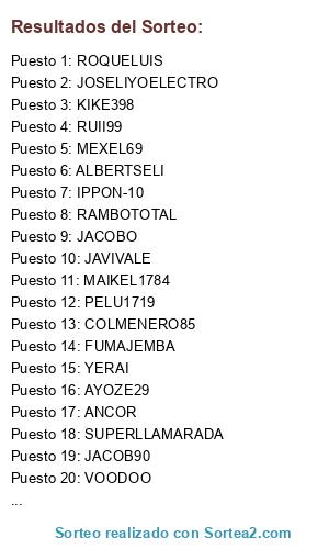 Lista de participantes: VOODOO, JAVIVALE, FUMAJEMBA, YERAI, AYOZE29, KAISSER, RAMBOTOTAL, JACOB90, ALBERTSELI, ROQUELUIS, JACOBO, ANCOR, RIZO, SEUTITO, KIKE398, GORRI7, PELU1719, COLMENERO85, MAIKEL1784, MEXEL69, RUII99, SUPERLLAMARADA, JOSELIYOELECTRO, IPPON-10.