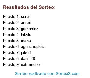 Lista de participantes: extremeitor, anreri, aguachupleis, dani_20, serer, manu, gomanlez, lakylu, jaborf.