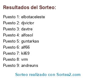 Lista de participantes: VRM21, juan_22, DAVTRE, guntarkas, andreuns, kil69, elbotaceleste, alfosol5, djvictor, ALF_66.