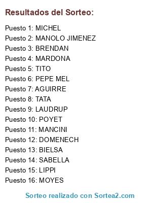 Lista de participantes: TATA, MOYES, TITO, MANCINI, MANOLO JIMENEZ, MARDONA, PEPE MEL, BIELSA, AGUIRRE, LAUDRUP, LIPPI, SABELLA, POYET, DOMENECH, BRENDAN, MICHEL.