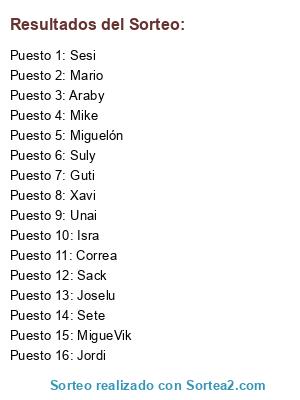 Lista de participantes: Jesuml, Bsgarcia, Halop123, Geralt_07, Dani_bvrn, Nadie34567, Dedi8s-EH, Fajardoman, Oriiool_20, mesio27, Miguelrp25, Xou86, Jjose84, Jose1979rml, aemepoam, Xoko1987, Ansale86, Farbax.