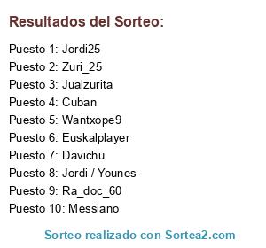 Lista de participantes: Jordi / Younes, Messiano, Cuban, Euskalplayer, Jualzurita, Davichu, Jordi25, Wantxope9, Ra_doc_60, Zuri_25.