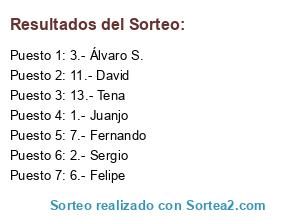 Lista de participantes: 1.- Juanjo, 2.- Sergio, 3.- Álvaro S., 4.- Álvaro L, 5.- Ivanca, 6.- Felipe, 7.- Fernando, 8.- Pedro, 9.- Raulinho, 10.- Javi, 11.- David, 12.- Nacho, 13.- Tena, 14.- Miguel.