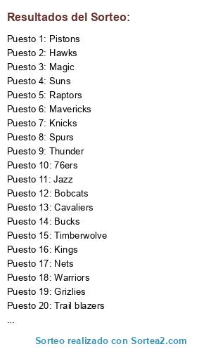 Lista de participantes: Grizlies, Pelicans, Mavericks, Spurs, Jazz, Nuggets, Thunder, Timberwolve, Trail blazers, Kings, Suns, 76ers, Knicks, Warriors, Nets, Raptors, Bucks, Bulls, Cavaliers, Pistons, Bobcats, Hawks, Heat, Magic.