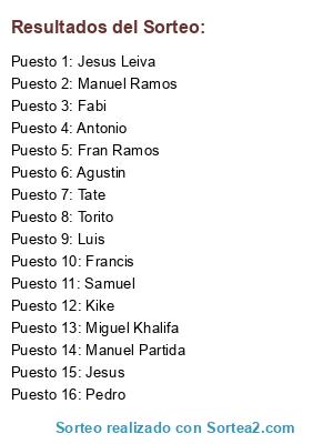 Lista de participantes: Torito, Francis, Samuel, Manuel Partida, Kike, Luis, Manuel Ramos, Jesus, Fabi, Fran Ramos, Tate, Antonio, Pedro, Jesus Leiva, Miguel Khalifa, Agustin.