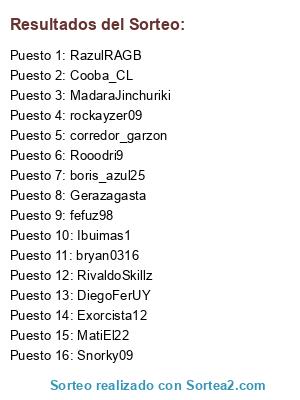 Lista de participantes: DiegoFerUY, Snorky09, Gerazagasta, Cooba_CL, RazulRAGB, corredor_garzon, rockayzer09, Rooodri9, MatiEl22, bryan0316, boris_azul25, RivaldoSkillz, Exorcista12, fefuz98, Ibuimas1, MadaraJinchuriki.