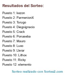 Lista de participantes: Diegoignacio, ParmenionX, Crack, Luxo, Ricky, Lithox, elemento, kezon, Ponaseba, Mauro, Llerar, Torugo.