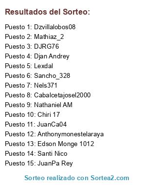 Lista de participantes: Anthonymonestelaraya, JuanCa04, Lexdal, Djan Andrey, Nathaniel AM, Cabalcetajosel2000, Santi Nico, Dzvillalobos08, Mathiaz_2, Edson Monge 1012, JuanPa Rey, Nels371, Chiri 17, Sancho_328, DJRG76.