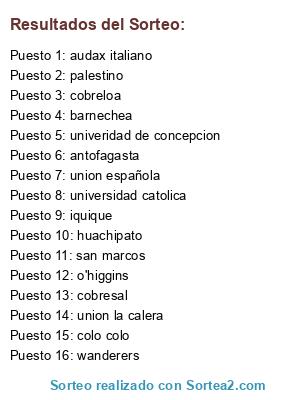 Lista de participantes: colo colo, huachipato, universidad de chile, union española, o'higgins, universidad catolica, palestino, wanderers , iquique, cobresal, union la calera, univeridad de concepcion, ñublense, audax italiano, antofagasta, cobreloa, san marcos, barnechea.