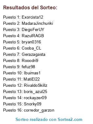 Lista de participantes: DiegoFerUY, Gerazagasta, velapuerca07, Snorky09, plane_2106, sennedjem, Bioptics, Marcelox4, rockayzer03, mafiu077, ironespel, nahur10, Sergio_Veisaga, MadaraJinchurilk, boris_azul25, manodel10.