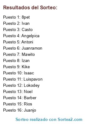 Lista de participantes: Casto, Barber, 8pet, Ivan, Lokodey, Kike, Juanjo, Juanramon, Angelpica, Isaac, Luispavon, Mawito, Rios, Izan, Antoni, Noel.