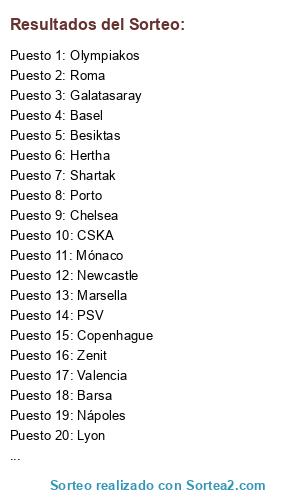 Lista de participantes: Barsa, Valencia, Celta, Mónaco, Bayer 04, Hertha, Anderlecht, Copenhague, Basel, Galatasaray, Besiktas, Nápoles, Roma, Lyon, Marsella, Niza, CSKA, Zenit, Newcastle, Chelsea, Sporting Lisboa, Porto, Shartak, Olympiakos, Ajax, PSV, Juventus, Rosenborg.
