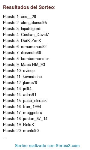 Lista de participantes: alen_alonso95, xes__28, arokita57, memetchite7, hervassalado, Nandetre, fran_1994, romanomad82, adris91, ReloK, markinhu6, bombermonster, cuchurulu, jlamp76, jnl94, maike_irene, blasinho, Maec-HM_93, DarK-ZenX, elcorso, Cristian_David7, paco_elcrack, pi69tu, hijodelgordi, iliasmofe69, maggiobrc, kevindinho, ovicop, JaviHrT, elfifamola, monto90, jordan_87_14.