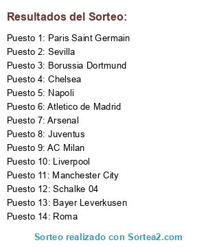 Lista de participantes: Arsenal, Manchester City, Liverpool, Chelsea, Sevilla, Atletico de Madrid, Roma, Juventus, AC Milan, Napoli, Paris Saint Germain, Schalke 04, Borussia Dortmund, Bayer Leverkusen.