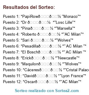 Lista de participantes: *Sari 👍🏽 *''Wolves''*, *Pesadilla👍🏽 *'' AC Milan ''*, *El Bosch👍🏽 *'' AC Milan ''*, *Maquilon👍🏽 *''Wolves''*, *Dr 👍🏽 *''Losc Lille''*, *Erick👍🏽 *''Newcastle''*, *Cáceres👍🏽 *''Cristal Palace''*, *Pina👍🏽 *''Marsella''*, *Oscar👍🏽 *''AC Milan''*, *David👍🏽 *''Lyon France''*, *Roberto 👍🏽 *''AC Milan''*, *PapiRow👍🏽 ''Monaco''*.