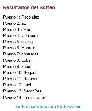 Lista de participantes: alvicio, awi, Bogart, contreras, Horacio, Javi, Lubin, manilmonte, Nandvs, Pacolaluz, SerchPes, skeu, vidalsergi, xabel.