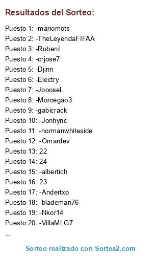 Lista de participantes: -Morcegao3, -normanwhiteside, -gabicrack, -blademan76, -crjose7, -Omardev, -whaTa, -albertich, -Electry, -Gorlami, -Rubenil, -TheLeyendaFIFAA, -JoooseL, -baruczgz, -Nkor14, -Djinn, -Jonhync, -EmiiRodriguezARG, -Andertxo, -mariomots, -VillaMLG7, 22, 23, 24.