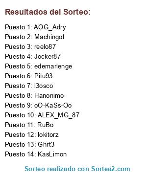 Lista de participantes: RuBo, Pitu93, KasLimon, Hanonimo, Ghrt3, oO-KaSs-Oo, Machingol, ALEX_MG_87, edemarlenge, reelo87, lokitorz, l3osco, AOG_Adry, Jocker87.