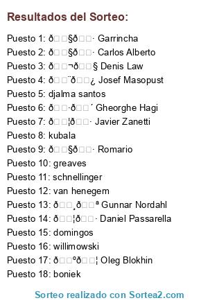 Lista de participantes: Diego Armando Maradona, 🇦🇷 Lionel Messi, 🇧🇷 Pelé, 🇳🇱 Johan Cruyff, 🇵🇹 Cristiano Ronaldo, 🇦🇷🇪🇸 Alfredo Di Stefano, 🇩🇪 Franz Beckenbauer, 🇫🇷 Zinedine Zidane, 🇭🇺 Ferenc Puskas, 🇧🇷 Ronaldo Nazario, 🇧🇷 Garrincha, 🇫🇷 Michel Platini, 🇳🇱 Marco van Basten, 🇬🇧 George Best, 🇮🇹 Franco Baresi, 🇧🇷 Zico, 🇩🇪 Gerd Muller, 🇮🇹 Giuseppe Meazza, 🇬🇧 Bobby Charlton, 🇮🇹 Paolo Maldini, 🇧🇷 Romario, 🇷🇺 Lev Yashin, 🇵🇹 Eusebio, 🇧🇷 Ronaldinho, 🇧🇷 Carlos Alberto, 🇮🇹 Valentino Mazzola, 🇬🇧 Bobby Moore, 🇧🇷 Socrates, 🇫🇷 Raymond Kopa, 🇩🇪 Lothar Matthaus, 🇦🇷 José Manuel Moreno, 🇮🇹 Paolo Rossi, 🇩🇪 Gunter Netzer, 🇬🇧 Stanley Matthews, 🇪🇸 Luis Suarez, 🇳🇱 Ruud Gullit, 🇮🇹 Gianni Rivera, 🇭🇺 Nandor Hidegkuti, 🇬🇧 Kenny Dalglish, 🇮🇹 Gianluigi Buffon, 🇨🇿 Matthias Sindelar, 🇩🇪 Fritz Walter, 🇧🇷 Didí, 🇺🇦 Oleg Blokhin, 🇺🇾 Juan Alberto Schiaffino, 🇧🇷 Roberto Rivellino, 🇩🇰 Michael Laudrup, 🇧🇷 Nilton Santos, 🇪🇸 Xavi Hernández, 🇧🇷 Jairzinho, 🇮🇹 Roberto Baggio, 🇮🇹 Gaetano Scirea, 🇸🇪 Gunnar Nordahl, 🇮🇹 Dino Zoff, 🇦🇷 Daniel Passarella, 🇩🇪 Karl-Heinz Rummenigge, 🇦🇷 Adolfo Pedernera, 🇪🇸 Andrés Iniesta, 🇬🇧 Kevin Keegan, 🇩🇰 Peter Schmeichel, 🇬🇧 Dixie Dean, 🇬🇧 Gordon Banks, 🇳🇱 Johan Neeskens, 🏴 Jimmy Johnstone, 🇵🇪 Teófilo Cubillas, 🇭🇺 Florian Albert, 🇮🇹 Samdro Mazzola, 🇳🇱 Dennis Bergkamp, 🇩🇪 Paul Breitner, 🇬🇧 John Charles, 🇺🇾 José Andrade, 🇦🇷 🇮🇹 Omar Sivori, 🇨🇿 Josef Masopust, 🇧🇷 Cafú, 🇬🇧 Denis Law, 🇳🇱 Frank Rijkaard, 🇫🇷 Just Fontaine, 🇮🇹 Gigi Riva, 🇫🇷 Thierry Henry, 🇷🇸 Dragan Dzajic, 🇲🇽 Hugo Sánchez, 🏴 Ryan Giggs, 🇮🇹 Giacinto Facchetti, 🇩🇪 Uwe Seeler, 🇦🇷 Gabriel Batistuta, 🇦🇷 Javier Zanetti, 🇩🇰 Allan Simonsen, 🇧🇬 Hristo Stoichkov, 🇧🇷 Roberto Carlos, 🇩🇪 Sepp Maier, 🇭🇺 Sandor Kocsis, 🇩🇪 Philipp Lahm, 🇸🇪 Zlatan Ibrahimovic, 🇧🇷 Djalma Santos, 🇺🇾 Obdulio Varela, 🇧🇷 Neymar, 🇦🇷 Mario Kempes, 🇲🇿 Mario Coluna, 🇷🇴 Gheorghe Hagi, pichichi, friedenreich, piola, mágico, orsi, scarone, varela, lahm, ibra, djalma santos, neymar, kempes, coluna, hagi, figueroa, zamora, domingos, quincoces, nasazzi, monti, sárosi, willimowski, leonidas, binder, zizinho, erico, bican, billy wright, ernst happel, kubala, edwards, czibor, schnellinger, schulz, gérson, greaves, chumpitaz, deyna, haan, van henegem, tostao, ruggeri, brehme, tardelli, francescoli, conti, voller, boniek, desailly, blanc, stam, thuram, keane, beckham, rooney.