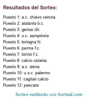 Lista de participantes: atalanta b.c., bologna fc, cagliari calcio, calcio catania, a.c. chievo verona, genoa cfc, u.s.c. palermo, parma f.c., pescara, u.c. sampdoria, a.c. siena, torino f.c..