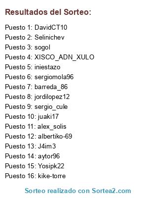 Lista de participantes: sergiomola96, Yosipk22, Selinichev, aytor96, DavidCT10, alex_solis, jordilopez12, kike-torre, barreda_86, juaki17, J4im3, sogol, sergio_cule, albertiko-69, iniestazo, XISCO_ADN_XULO.