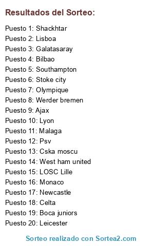Lista de participantes: Werder bremen, Lyon, Bilbao, Monaco, Malaga, Olympique, Ajax, Psv, Southampton, Leicester, West ham united, Galatasaray, Lisboa, Shackhtar, Cska moscu, LOSC Lille, Boca juniors, Celta, Newcastle, Stoke city.