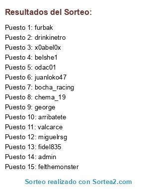Lista de participantes: felthemonster, juanloko47, arribatete, bocha_racing, miguelrsg, belshe1, drinkinetro, x0abel0x, george, odac01, valcarce, furbak, fidel835, admin, chema_19.