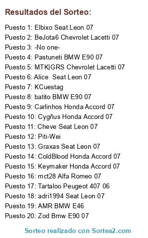 Lista de participantes: Alice Seat Leon 07, Cygñus Honda Accord 07, BeJota6 Chevrolet Lacetti 07, Keymaker Honda Accord 07, ColdBlood Honda Accord 07, MTK|GRS Chevrolet Lacetti 07, Carlinhos Honda Accord 07, adri1994 Seat Leon 07, Cheve Seat Leon 07, AMR BMW E46, mct28 Alfa Romeo 07, Zod Bmw E90 07, Tartaloo Peugeot 407 06, batito BMW E90 07, Pastuneti BMW E90 07, Graxas Seat Leon 07, Elbixo Seat Leon 07, Piti-Wei, KCuestag, -No one-.