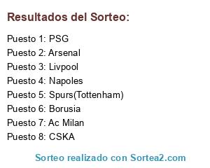 Lista de participantes: Borusia, Spurs, PSG, CSKA, Napoles, Livpool, Arsenal, AC Milan.
