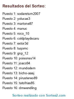 Lista de participantes: dmwendling, tuqomc, gnp_12, pirustereo89, manuc, coldplaydscaru, sodareturn2007, roco_10, poisonss14, extor3d, martone87, tatofrias85, joaco94, mundodem, yolucas3, bicho-aaaj.