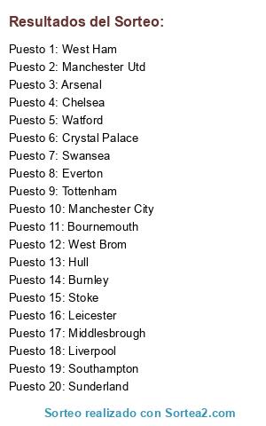 Lista de participantes: Arsenal, Bournemouth, Burnley, Chelsea, Crystal Palace, Everton, Hull, Leicester, Liverpool, Manchester City, Manchester Utd, Middlesbrough, Southampton, Stoke, Sunderland, Swansea, Tottenham, Watford, West Brom, West Ham.