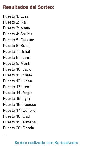 Lista de participantes: Matty, Leo, Menadel, Edrielle, Jack, Sutej, Anubis, Rai, Lysa, Zarek, Daphne, Merik, Laoisse, Urian, Lyra, Hyo, Angie, Liam, Derain, Cad, Ximena, Belial.