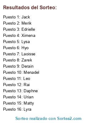Lista de participantes: Laoisse, Merik, Lyra, Daphne, Rai, Menadel, Leo, Matty, Urian, Lysa, Zarek, Ximena, Jack, Derain, Edrielle, Hyo.